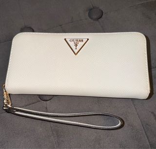 Elegante cartera Guess en color blanco con detalles dorados. Perfecta para llevar tus esenciales con estilo. - Diseño con cierre de cremallera. - Incluye correa de mano. - Logo de Guess en la parte frontal. Medidas en fotos
