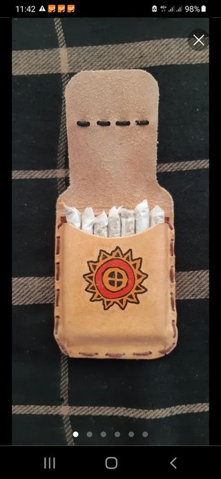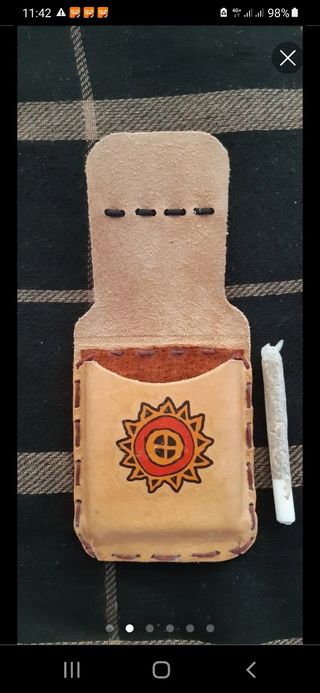 Nueva, para 7 pitillos de liar.Hecha a mano cuero vacuno.El dibujo es una calcomania al agua,cuando se te afee la metes bajo el agua con cepillo y jabon y la dejas impoluta.Mira la mia recien lavada..Luego le pones otra o grabas lo que quieras,o nada.Envio por wallapop