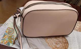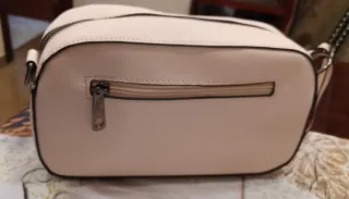 Bolso tipo cartera en un bonito tono rosa pálido, con detalles en negro. - Cierre de cremallera. - Asa de mano. - Incluye etiqueta. Medidas 25 x 15 x 7 cms