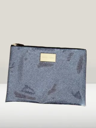 Elegante cartera de mano con un acabado brillante y detalles metálicos. - Diseño moderno y versátil. - Cierre de cremallera. - Placa dorada con el logo de la marca.