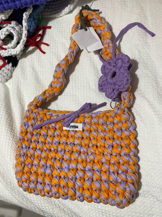 Bolso hecho a mano con trapillo, ideal para llevar tus esenciales. - Diseño tejido a mano. - Cierre con lazada. - Asa de hombro con detalle. - Incluye etiqueta de marca.