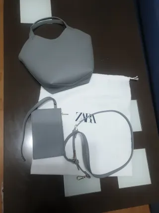 Bolso pequeño de Zara en color gris azulado. Incluye una bolsa de tela para guardarlo y una cartera a juego. - Diseño moderno y minimalista. - Material sintético de calidad. - Asa corta para llevar en mano. - Correa larga ajustable para hombro o cruzado.