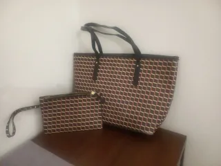 Conjunto de bolso de mano y cartera a juego con un diseño geométrico. - Bolso grande con asas. Base 13cm, ancho 40 cm, largo sin asas 25 cm, largo asas 25 cm - Cartera con cremallera y asa. - Estampado en tonos marrones y negros.