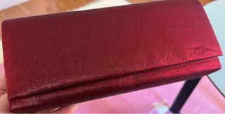 Elegante cartera de mano con un acabado brillante. - Color rojo intenso. - Textura satinada con destellos. - Diseño tipo sobre.Dentro lleva para colgar y nunca se uso.Lleva bolsa de regalo
