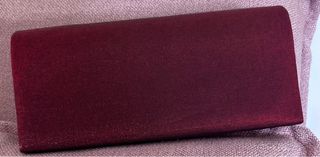 Elegante bolso de mano en color burdeos, perfecto para complementar un look perfecto. - Material satinado con un sutil brillo. - Diseño tipo sobre con solapa y cierre imán. - Departamento interior con cremallera pequeña. - Cadena fina plateada para llevar al hombro o también sin cadena como cartera de mano. Completamente nuevo!
