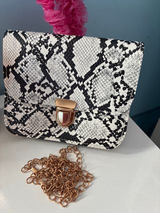 Elegante bolso de mano con cadena dorada, perfecto para ocasiones especiales. - Diseño geométrico con detalles en negro y dorado. - Textura tipo piel de serpiente en la parte frontal. - Cadena metálica dorada para llevar al hombro o cruzado.