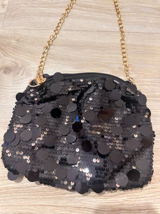 Elegante bolso con un diseño brillante de lentejuelas. - Medidas fabricante: Alto : 16cm Profundidad: 1cm Ancho: 22,5 cm - Acabado en lentejuelas negras y detalles dorados. - Cadena dorada para llevar al hombro o como clutch.