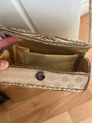 Elegante bolso de mano con un intrincado bordado artesanal, perfecto para ocasiones especiales. - Diseño con detalles dorados y pedrería. - Acabado en tela con motivos. - Estilo clutch o cartera de mano.