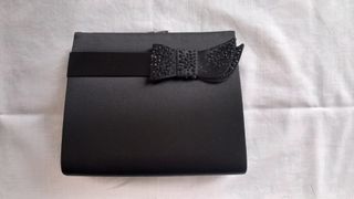 Vintage dressing bolso elegante de mano pequeño tipo cartera, en color negro de raso satinado. (Negocio precio). Tiene como detalle en el frontal un lazo con pedrería negra (lleva una bolsita dentro del bolsillo de repuesto). Se puede llevar como cartera de mano o colgado, ya que lleva una cadena en color negro. Ideal para llevar en fiestas, bodas o eventos. El cierre también es de color negro
