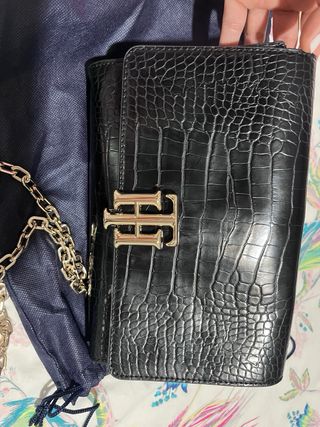 Elegante bolso negro con acabado de cocodrilo. Cuenta con un distintivo logo TH dorado en la parte frontal y una cadena dorada para llevarlo cruzado o al hombro, o en mano al quitarle esa cadena y utilizarlo tipo cartera de fiesta. - Acabado texturizado imitación cocodrilo. - Detalle de logo TH dorado.