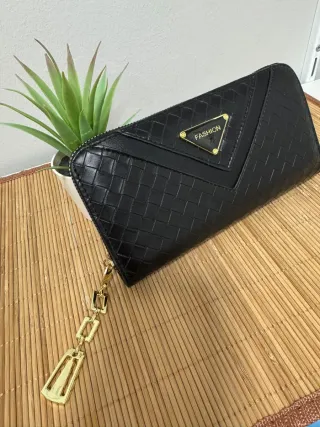 Elegante cartera de mano con un diseño moderno y sofisticado. - Acabado tejido en la parte frontal. - Detalle triangular con la palabra FASHION. - Cremallera completa para mayor seguridad. - Colgante metálico dorado con eslabones.