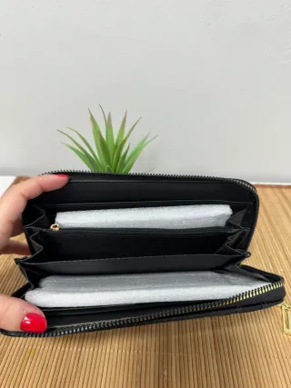 Cartera de mano en color negro. - Diseño elegante y funcional. - Múltiples compartimentos interiores. - Cierre de cremallera completo.