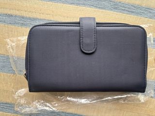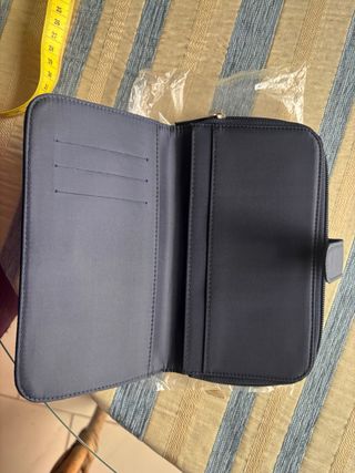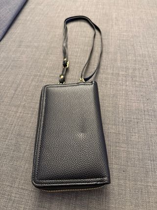 Elegante cartera-monedero con un diseño moderno y práctico. - Material con textura. - Cierre de cremallera. - Incluye correa de mano. Tiene una pequeña mancha en el tirador de la cremallera pero apenas se aprecia. Largo 20c, ancho 10c