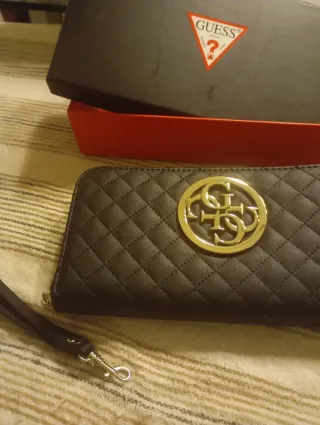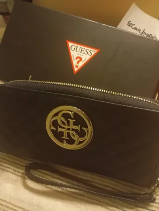 Elegante cartera de mano de la marca Guess. Perfecta para llevar tus esenciales con estilo. - Diseño moderno con logo. - Incluye correa de mano.