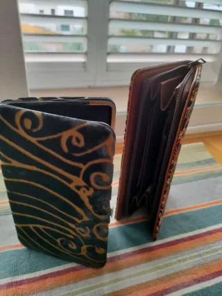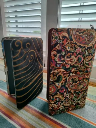 2 Elegantes carteras de mano con un llamativo diseños. - cartera de tamaño medio, terciopelo negro + fondo amarillo ocre, con motivos de caracola y olas. Cierre de automático. - carte más grande con estampado colorido, de motivos indios sobre fondo negro. Cierre de cremallera y cabe el teléfono :)