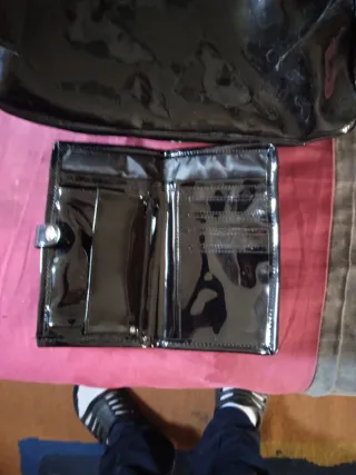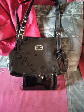 Conjunto de bolso y cartera a juego. - Bolso de charol con cierre de cremallera. - Cartera a juego con cierre de botón. - Diseño brillante y elegante.