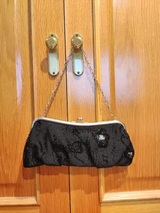 Elegante cartera de mano, perfecta para eventos especiales. Su diseño vintage y detalles la hacen única. - Adornada con pedrería y lentejuelas. - Cierre de broche metálico. - Incluye cadena fina para llevar al hombro.