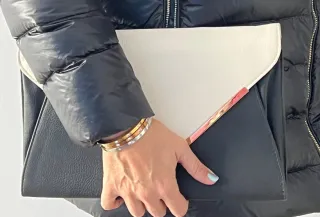 Cartera mano grande negra acolchada (que cabe hasta una tablet) con pulsera para la muñeca