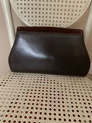 Cartera de mano de cuero marrón. Es un bolso pequeño y compacto, ideal para llevar lo esencial. Ancho 23,5 cm Alto 13,5 cm. - Está hecho de cuero. - Tiene un cierre de presión y un bolsillo con cremallera interior. - Presenta un aspecto vintage y desgastado, lo que le da un toque único.