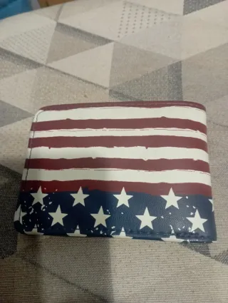 Cartera con diseño inspirado en la bandera de Estados Unidos.4 tarjeteros,1 para foto y 2 billeteros - Diseño de rayas rojas y blancas. - Sección azul con estrellas blancas.