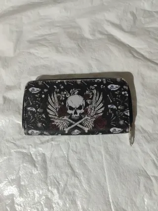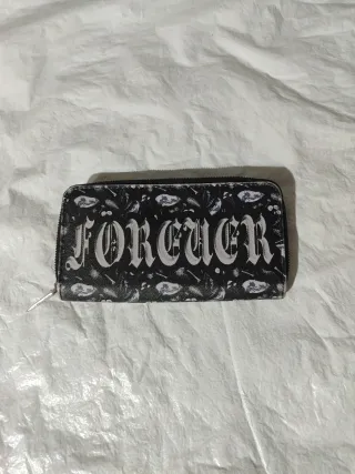 Cartera monedero con cremallera, con un diseño llamativo de calavera, alas,rosas y texto forever en letras góticas. - Estampado detallado. - Cierre de cremallera. - cartera larga, 20cm