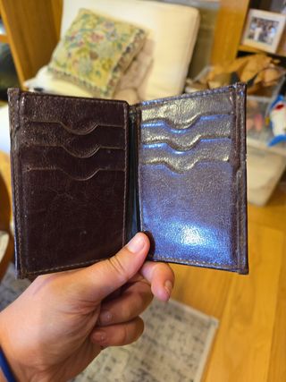 Cartera de Piel, color Natural, Repujado de flores. diferentes esp2acios, 20 X 10 cm. 15 euros. Billetero de Piel, Color, Gris oscuro<. Nueva. 22 X 15 cm. 30 euros. Cartera Nueva con cremallera. 20 X 10 ( no piel) 10 euros.