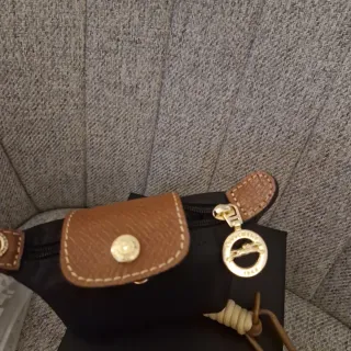 Pequeño monedero de la marca Longchamp con detalles en cuero. - Color negro con solapa marrón. - Cierre de cremallera. - Detalle de botón dorado con logo.