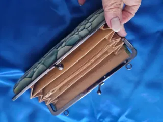 Elegante Cartera billetera de ante verde y piel. Creo que es marca El Caballo. Especialmente dedicada para los asistentes a un congreso. Se conserva en su caja. Cartera, monedero, billetero #cartera #carteradecuero #carteradepiel #billetera #monedero Su diseño combina materiales de calidad para un look sofisticado. - Material exterior de ante verde. - Detalle de piel en color coñac. - Costuras decorativas y perforaciones.
