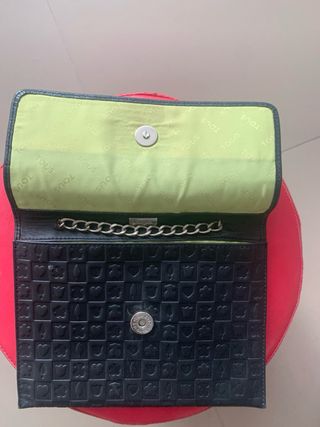 Cartera o monedero con un diseño llamativo de círculos. - Estampado de círculos blancos sobre fondo verde. - Cierre de cremallera. - Pequeño detalle de marca en la solapa.