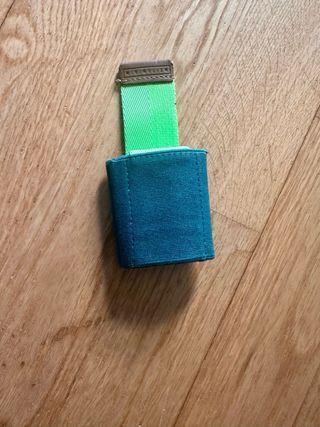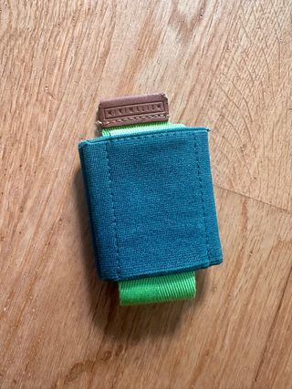 Cartera de la marca Minimalism. - Diseño en color verde y azul. - Etiqueta de cuero con el logo.