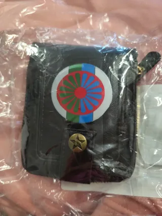 Cartera de color negro con un distintivo circular en la parte frontal. El diseño de la insignia es una rueda con radios de colores. - Cierre de botón a presión. - Detalle de estrella en el botón. - Cremallera lateral. No es la marca que pone