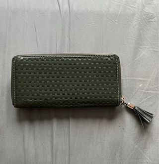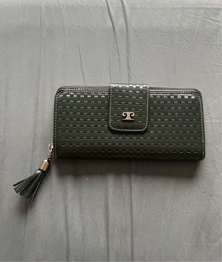 Elegante cartera de la marca Pierre Cardin. - Diseño tejido en tono verde oliva. - Cierre de cremallera. - Detalle de borla. - Logo metálico en la solapa.
