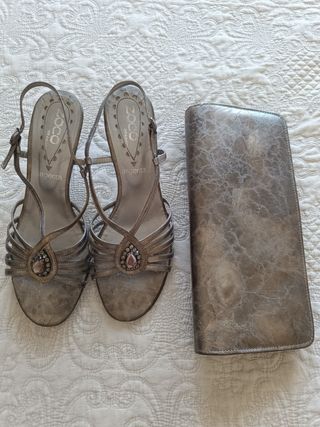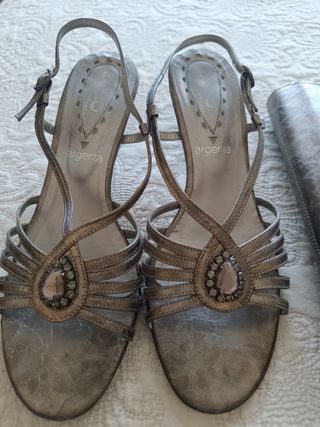Elegante conjunto de sandalias y cartera para fiesta de piel marca Argenta. - Sandalias de tiras finas con detalle de pedrería. - Cartera a juego con textura metalizada. Son un 38 pero tallan grande, equivalen a un 39 de otros modelos Solo usados en dos ocasiones.