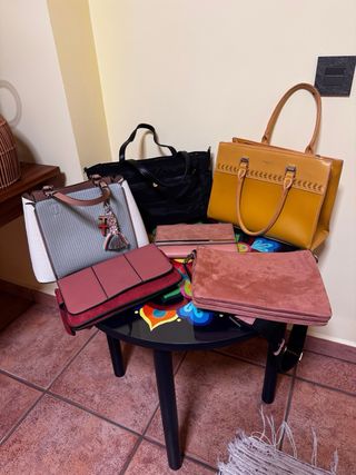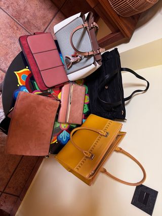 Conjunto de 7 bolsos de diferentes estilos y colores. Varias marcas, principalmente Parfois y Sfera. Alguno sin estrenar y el resto casi sin uso - Bolso grande en color mostaza. - Bolso tipo cartera en color terracota. - Bolso de mano en color rojo. - Bolso azul y blanco con detalles en marrón. - Bolso negro de tela. - bolso nate verde y tachuelas
