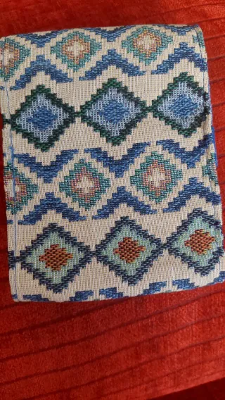 Pequeña cartera intima para mujer, con un diseño llamativo y cierre de botón. - Tejido exterior con patrón geométrico en tonos azules, verdes y beige. - Panel frontal de tela vaquera azul. - Cierre con botón azul y cordón elástico para tampones + bolsillo para compresas (tamaño normal) tampones medianos o grandes - Ideal para el bolso