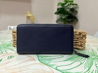 Cartera grande de mujer con un diseño moderno y elegante. - Logo metálico de la marca en la parte frontal. - Detalles de rayas en blanco, rojo y azul en la parte inferior. - Cremallera completa para un acceso seguro. - Tiene varios compartimentos para tarjetas, billetes y cremallera para las monedas.