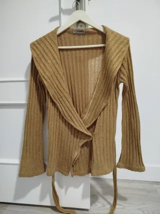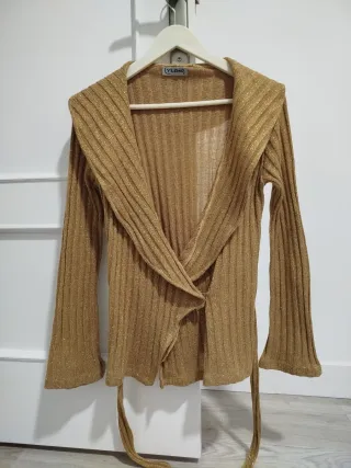 ✨ ¡Brilla con Estilo! Chaquetilla/Blusa Cruzada Dorada YLP (Talla S/M) ✨ 🌟 Descripción de la Prenda ¡Prepárate para deslumbrar! Esta preciosa chaquetilla o blusa de punto fino de la marca YLP es la pieza perfecta para cualquier evento donde quieras destacar. Color: Dorado/Cobre brillante con un sutil efecto lúrex que capta la luz. Diseño: Elegante corte cruzado (tipo wrap o cartera) con un nudo frontal decorativo. Escote: Cuello tipo chal/capucha grande muy original y favorecedor. Tejido: Punto elástico de canalé fino que se ajusta y estiliza la figura. ¡Es comodísima! Manga: Larga y ajustada.
