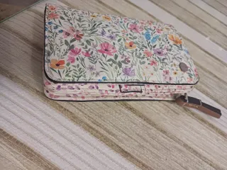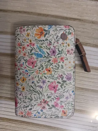 Elegante cartera con un bonito estampado floral. - Diseño con múltiples flores y hojas. - Acabado con ribete negro. - Incluye una pequeña correa. - Cierre de solapa.