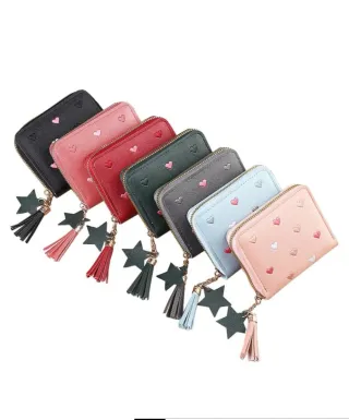Pequeña cartera con un diseño encantador de corazones bordados y un detalle de estrella con borla. - Cierre de cremallera. - Adorno de estrella con borla. - Diseño de corazones bordados. - Varios colores