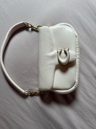 Bolso de mano Coach en color crema, un accesorio versátil y elegante. Estilo baguette, confeccionado en material efecto piel suave con acabado ligeramente acolchado. Diseño estructurado con solapa frontal y cierre metálico dorado en forma de “C”, que aporta un toque sofisticado y reconocible. Asa corta rígida desmontable con herrajes dorados, ideal para llevar al hombro y elevar cualquier look. Tamaño perfecto para llevar lo imprescindible (móvil, cartera, gloss y llaves). Un básico atemporal, elegante y muy versátil: ideal tanto para looks de día minimalistas como para una cena especial.