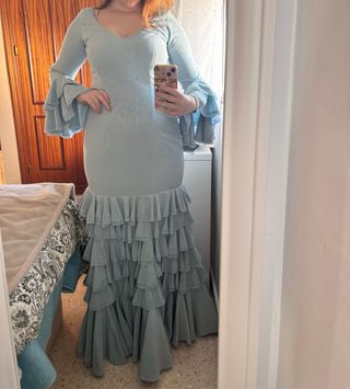 Traje de flamenca celeste con volantes