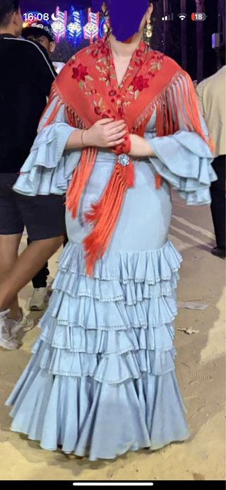 Vendo mi traje de gitana, es de un tono azul celeste/bebe. No incluyo el mantoncillo.Los volantes son preciosos, tienen una pequeña puntilla al final de cada volante. El traje en sí es muy cómodo. La talla que indica es la 44, por lo que sería aproximadamente para una L/M. Se le pueden sacar centímetros aún por todos lados menos en las entrepierna(zona que corta del tronco a los volantes inferiores). Incluye un bolsillo en el lateral de las enaguas para meter movil y cartera. Si tienes alguna duda, pregunta sin apuro 😊. Precio negociable.