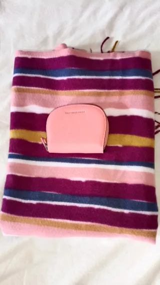 Conjunto de pañuelo y monedero a juego con un diseño de rayas vibrantes. El pañuelo tiene flecos en los extremos y el monedero es de un tono coral. - Cartera de PACO MARTÍNEZ. - Pañuelo SIN MARCA. - SIN USAR. - Diseño de rayas multicolor. - Monedero con cierre de cremallera.
