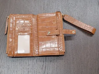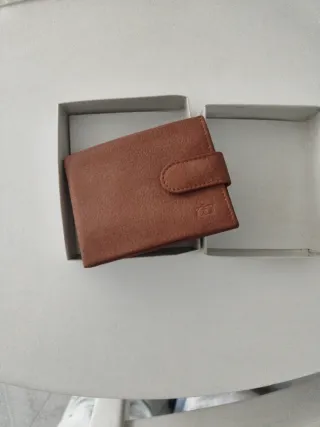 Cartera de piel en color marrón, completamente nueva. - Cierre con botón a presión. - Compartimentos interiores. - Diseño elegante y funcional.