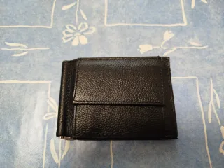 Elegante cartera de piel con un práctico clip para sujetar billetes. Su diseño compacto la hace ideal para llevar en cualquier bolsillo. - Material: Piel texturizada. - Color: Negro. - Cierre: Clip metálico para billetes.