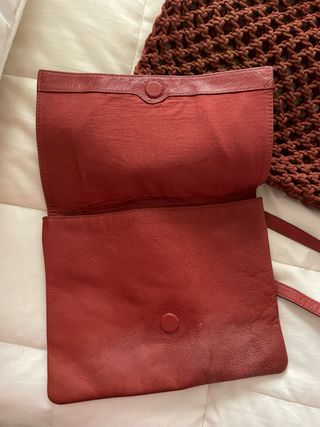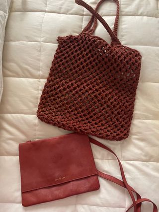 Conjunto de dos bolsos, uno de crochet y otro de piel. - Bolso de crochet en color terracota. - Cartera de piel en color rojo.