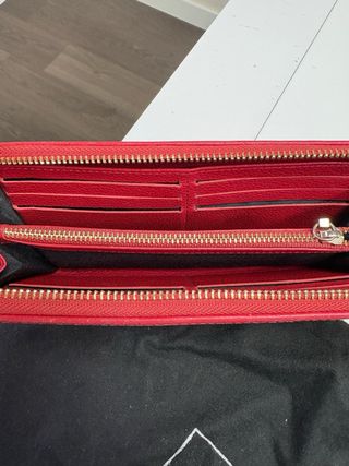 Cartera grande de piel en color rojo. - Cierre de cremallera. - Logo metálico de la marca en la parte frontal. - Incluye funda guardapolvo con logo PG.