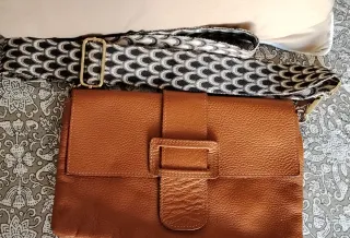 Bolso tipo cartera de piel en color camel. Incluye una correa ajustable con un diseño llamativo. - Material: Piel - Color de la correa: Multicolor (negro, blanco, gris) - Cierre con hebilla decorativa