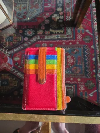 Elegante cartera de piel con un diseño vibrante inspirado en los colores del arcoíris. - Confeccionada en piel de alta calidad. - Múltiples ranuras para tarjetas. - Cierre seguro con botón a presión.