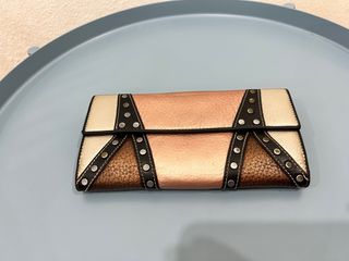 Elegante cartera de piel con un diseño patchwork en tonos beige, rosado y marrón metalizado. Los detalles metálicos y las costuras le dan un toque moderno. - Material: Piel - Combinación de colores: Beige, rosado y marrón Exterior sin rozaduras, interior con desgaste normal por uso (monedero)